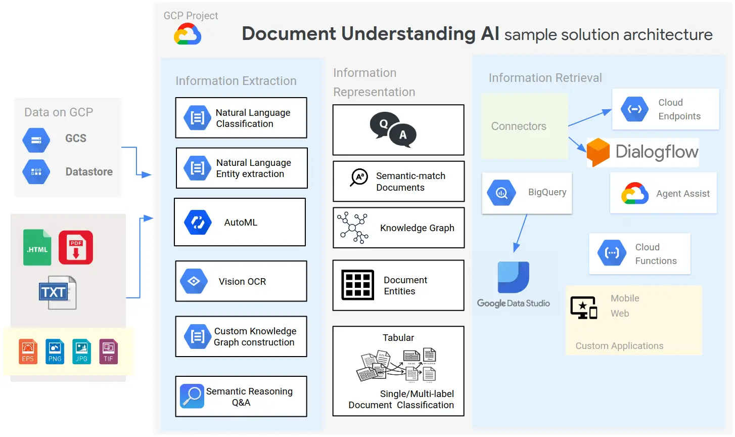 Administración de los documentos: Es la pieza clave y básica que conocemos del Document Understanding AI. Se incluye la digitalización, el rescate y clasificación de múltiples tipos de documentos en formatos que van desde los doc hasta html. No solo son documentos lo que administra sino que también lo hace con los gráficos.
